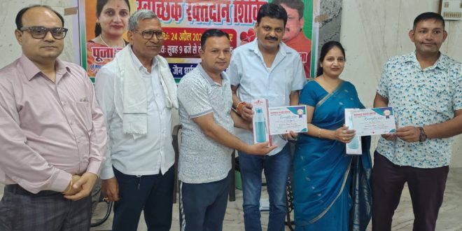 वरिष्ठ समाजसेविका पूजा गुप्ता तथा कांग्रेस के प्रदेश महामंत्री सचिन गुप्ता के संयोजन में लगाए गए शिविर में रक्तवीरों ने किया रक्तदान