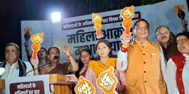 देहरादून / महिला आरक्षण के मुद्दे को लेकर मातृशक्ति नें देहरादून में गांधी पार्क से घंटाघर तक महिला आक्रोश मशाल यात्रा निकाली। इस यात्रा में मुख्यमंत्री पुष्कर सिंह धामी और मंत्री रेखा आर्या सहित बड़ी संख्या में पार्टी पदाधिकारी और महिलाएं शामिल रहीं।
